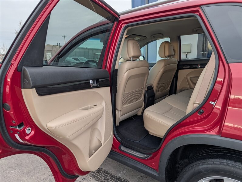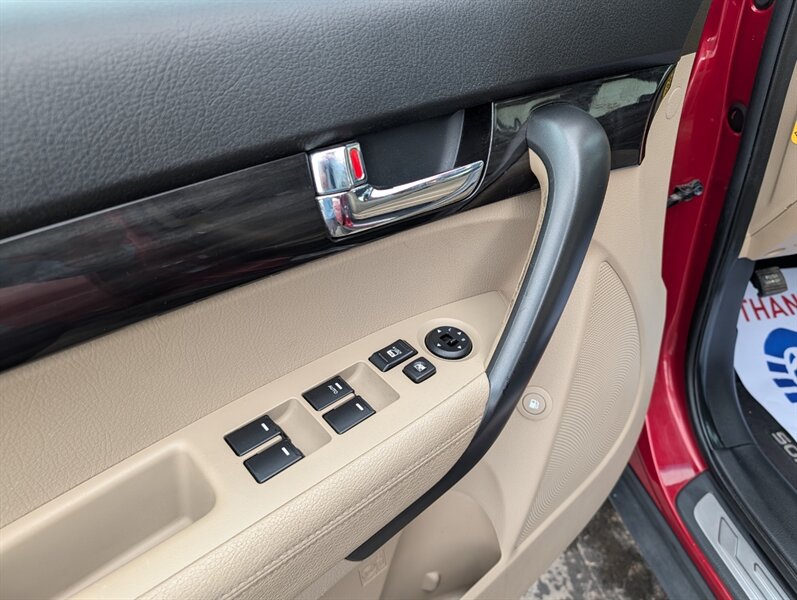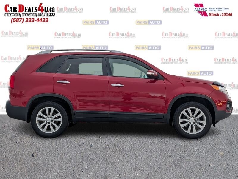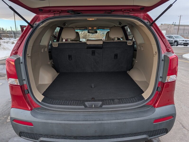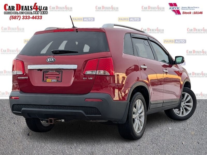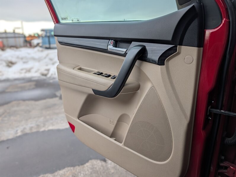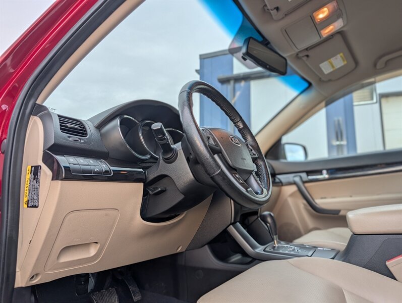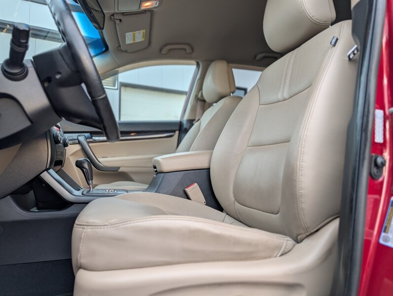 2011 Kia Sorento EX in Spicy Red with a Beige interior, in excellent overall condition. Powered by a 3.5L V6 producing 276 hp and 248 lb-ft, paired with a 6-speed automatic transmission (all-wheel drive). Factory-equipped EX features include leather-trimmed heated front seats with power driver adjustment,18-inch alloy wheels, fog lamps, dual-zone automatic climate control, cruise control, steering-wheel audio controls, Bluetooth hands-free, AM/FM/CD/MP3 audio with auxiliary input and satellite capability, power windows/locks/mirrors, keyless entry, and safety systems such as ABS, electronic stability and traction control, multiple airbags and tire pressure monitoring.