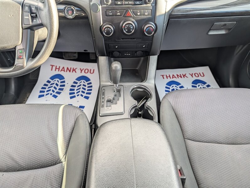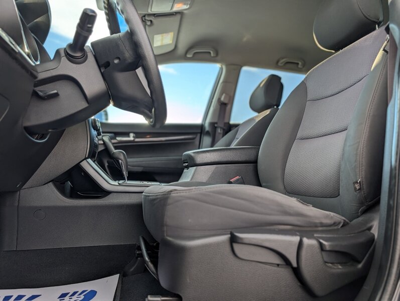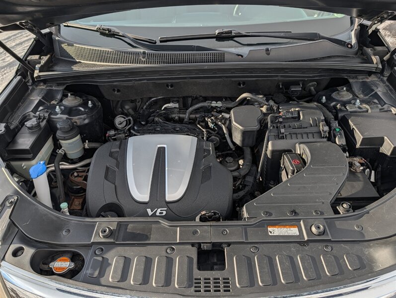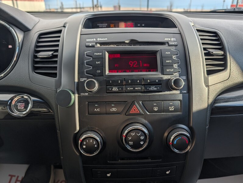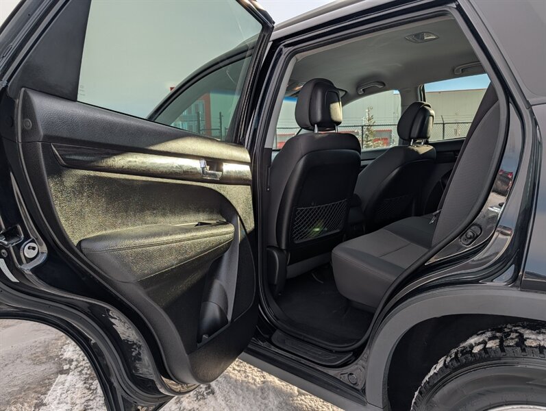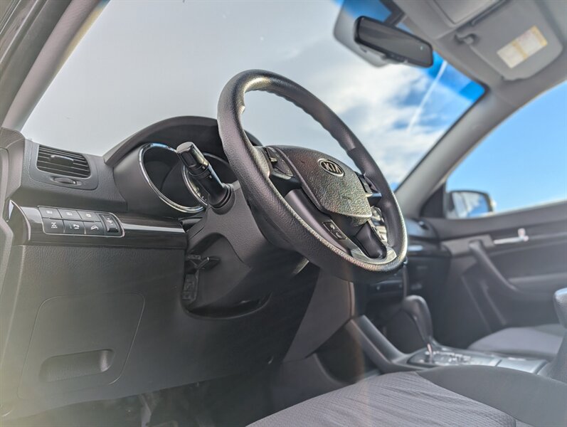 2012 Kia Sorento LX powered by a 3.5L V6 producing 276 hp and 248 lb-ft, factory-paired with a 6-speed automatic transmission. Factory-equipped features include power windows and door locks with, air conditioning, cruise control and tilt steering, cloth seating with split-folding rear seats (third row available), an AM/FM/CD/MP3 stereo with auxiliary/USB input and steering-wheel audio controls, and standard safety equipment such as front and side airbags, curtain airbags, ABS, electronic stability and traction control, tire pressure monitoring and LATCH child-seat anchors. Exterior is Ebony Black with a Black interior; this vehicle is in excellent overall condition.