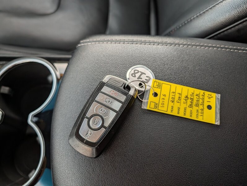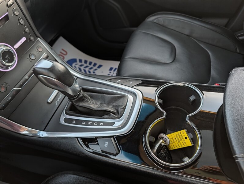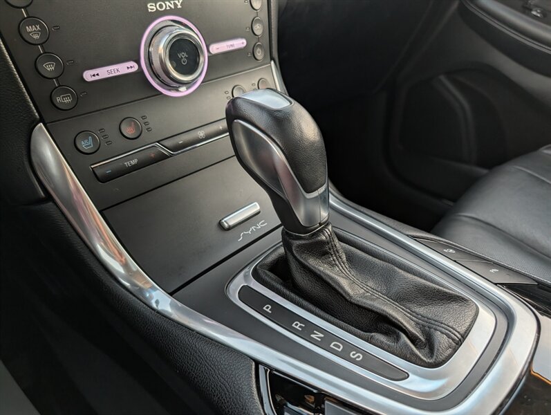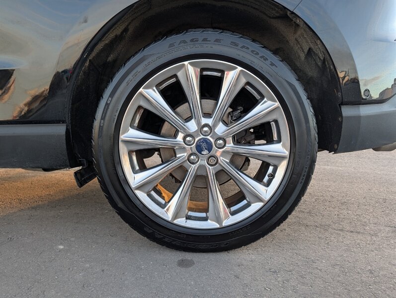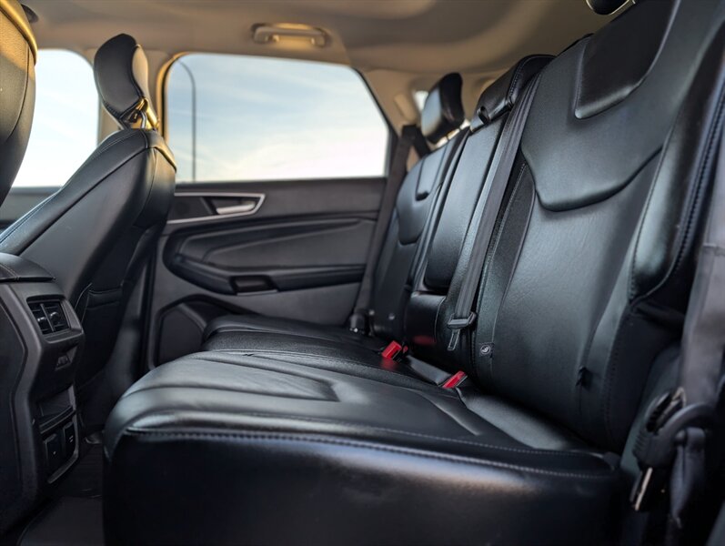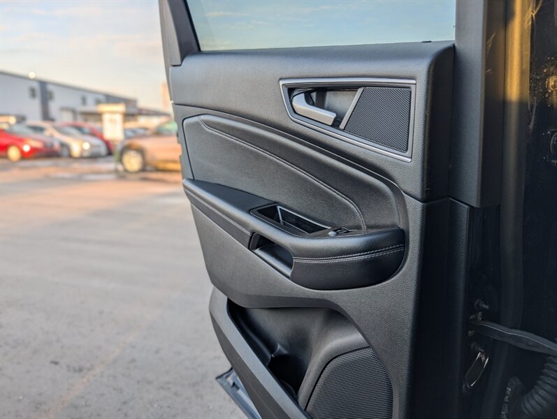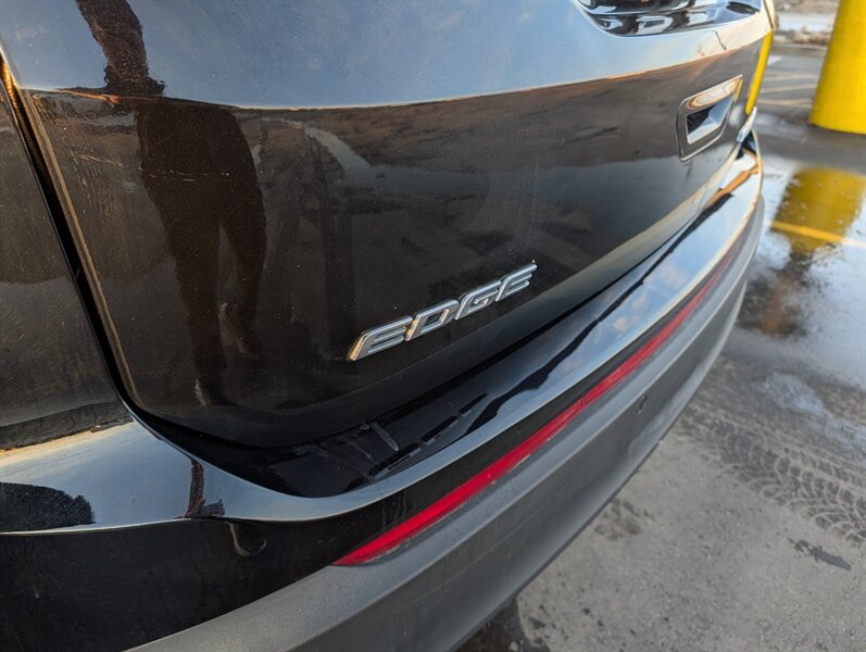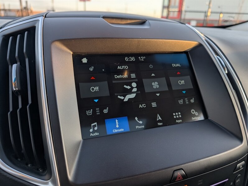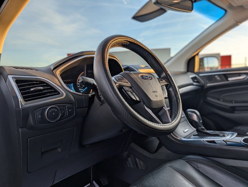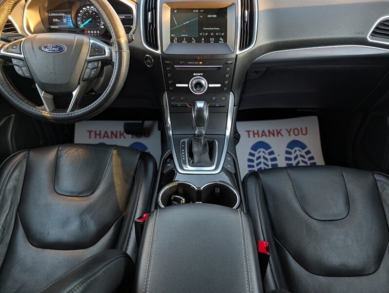 2017 Ford Edge Titanium in Shadow Black with an Ebony interior, in excellent overall condition and powered by an EcoBoost 2.0L Turbo I4 (245 hp, 275 lb-ft). Factory-equipped Titanium features typically include leather-trimmed front seats with heating and ventilation, power-adjustable driver seat with memory and a heated steering wheel, and dual-zone automatic climate control. Technology and convenience items include Ford SYNC 3 with touchscreen, Bluetooth and smartphone integration, rearview camera, keyless entry with push-button start and a power liftgate, plus a premium audio system. Standard safety and driver-assist equipment on the Titanium commonly includes blind-spot monitoring with cross-traffic alert, rear parking sensors, ABS, traction and stability control, and multiple airbags.