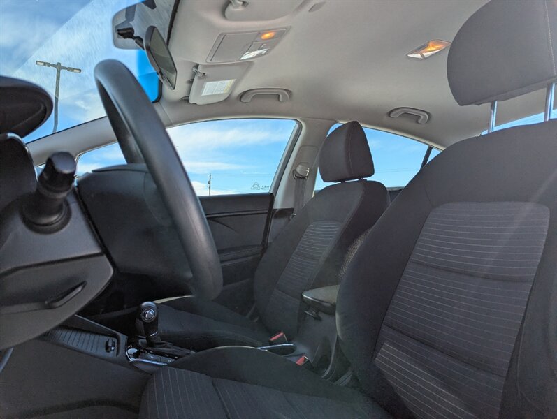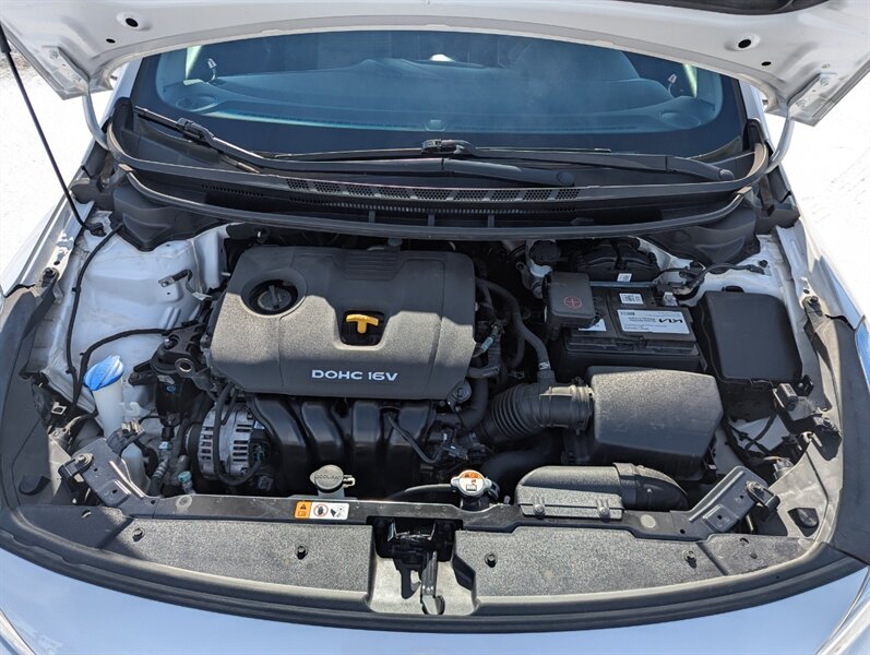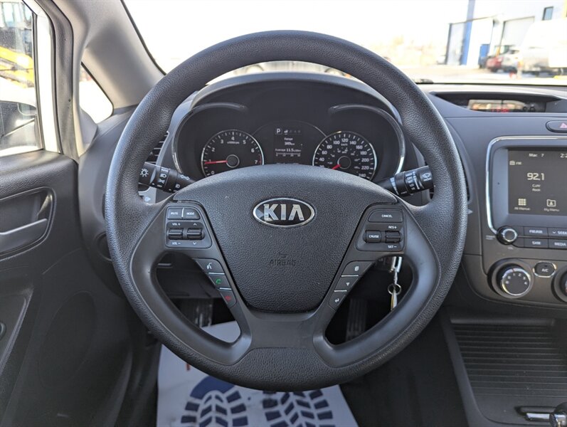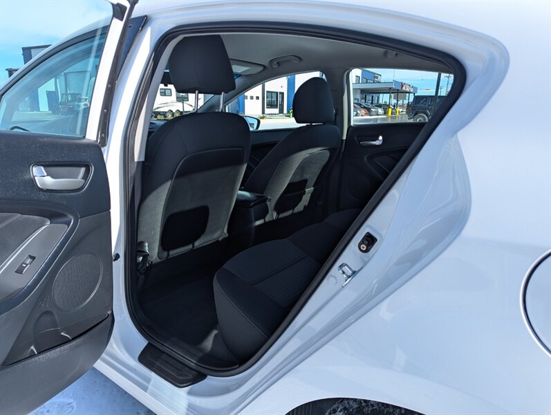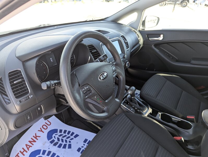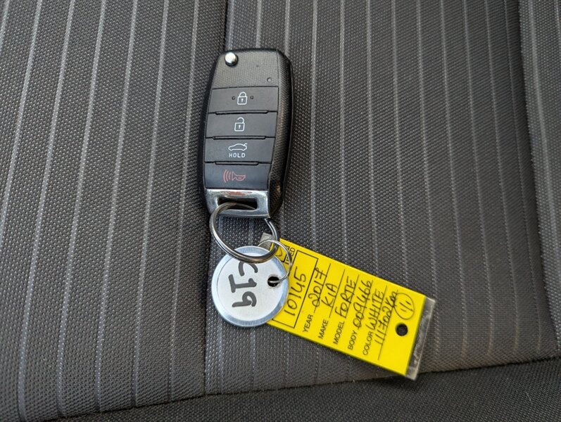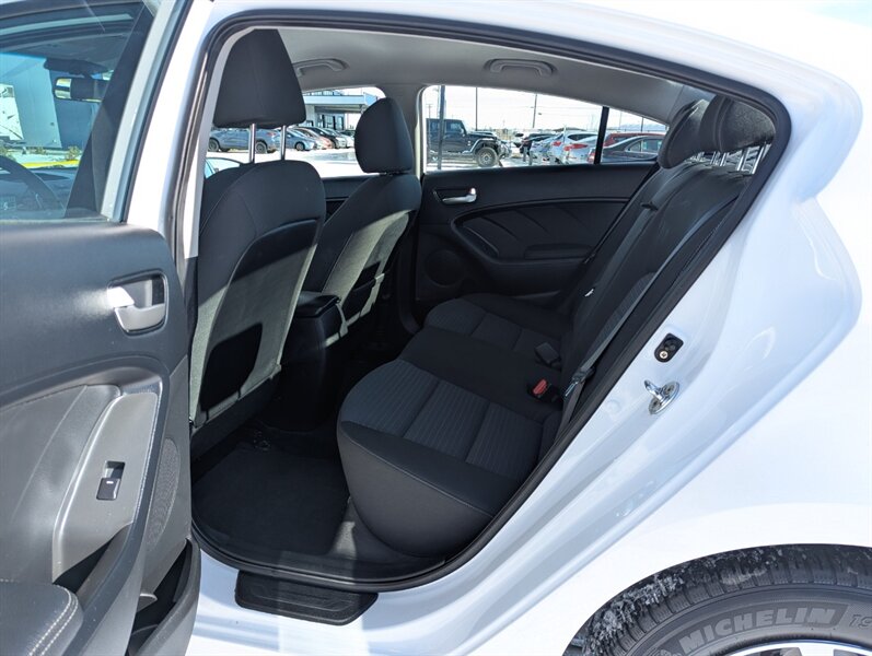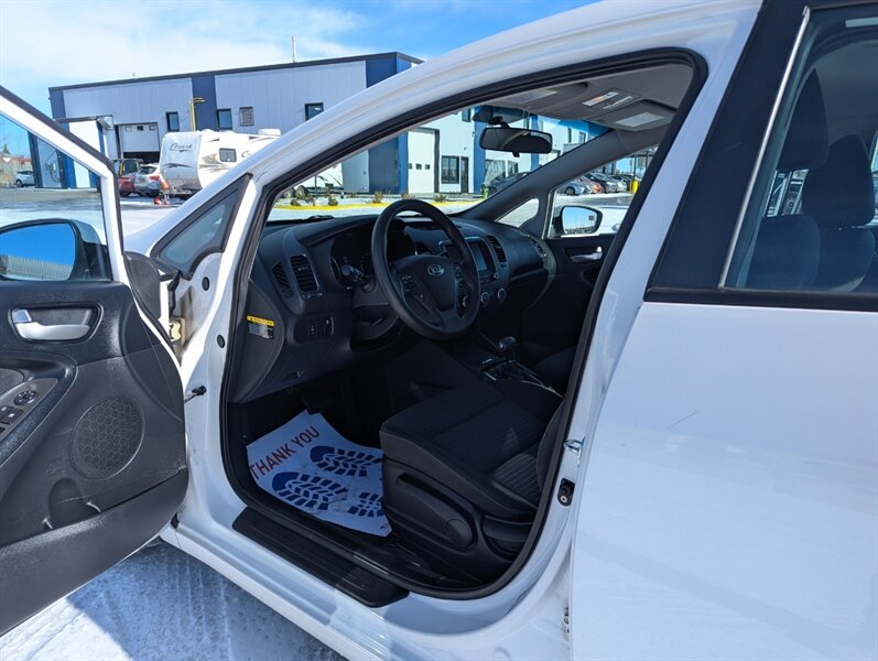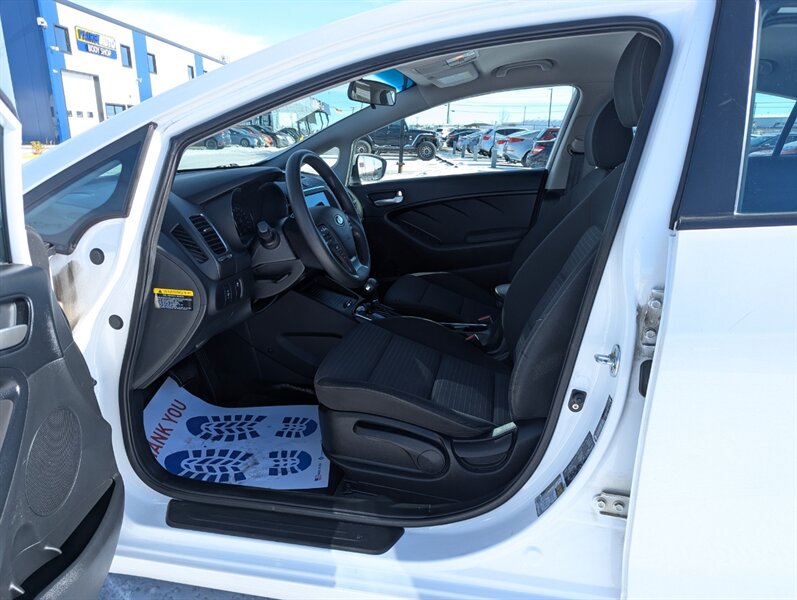 2017 Kia Forte LX in Clear White with a Black cloth interior, in excellent overall condition. Powered by the Nu 2.0L I4 (147 hp, 132 lb-ft), the vehicle’s factory-standard equipment includes cloth seating, a 60/40 split-folding rear seat, manual climate control, power windows and door locks, remote keyless entry, Bluetooth hands-free and audio streaming, USB/AUX inputs, and steering-wheel audio/phone controls. Standard safety and convenience features include ABS, electronic stability and traction control, multiple airbags, and a tire-pressure monitoring system; exterior appointments include halogen headlights and body-color mirrors.