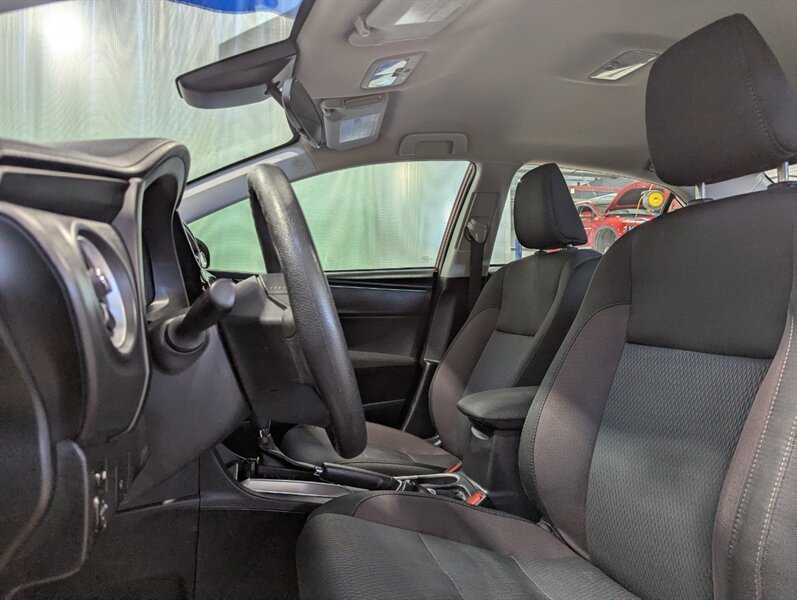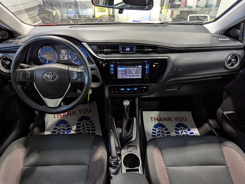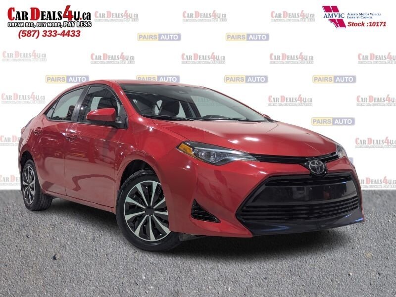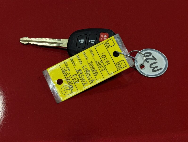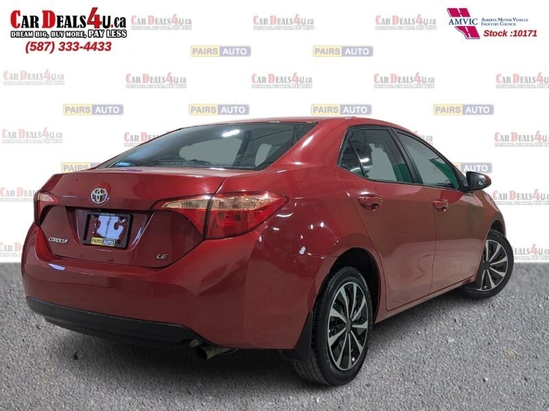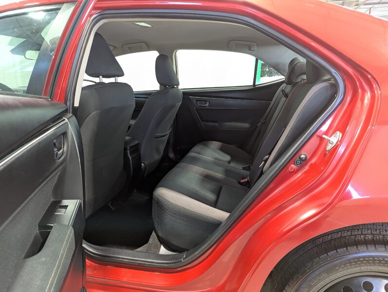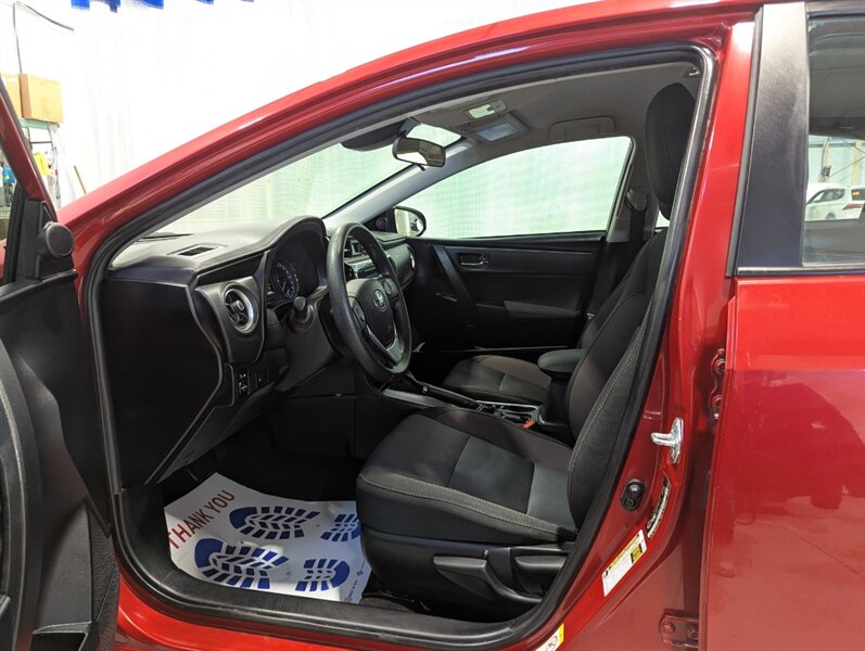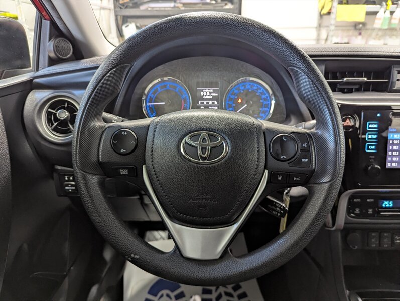 2017 Toyota Corolla LE in Barcelona Red Metallic with a Black cloth interior, powered by a 1.8L I4 (132 hp, 128 lb-ft) mated to a CVT. Factory equipment includes cloth seating with a 60/40 split-folding rear seat, power windows and door locks, remote keyless entry, air conditioning, tilt/telescoping steering wheel, and cruise control. Infotainment is Toyota Entune with a 6.1-inch display, Bluetooth hands-free and audio streaming, USB and auxiliary inputs, steering-wheel audio controls and a six-speaker system; a rearview backup camera is also included. Safety and convenience features from the factory include ABS with electronic brake-force distribution, traction and vehicle stability control, front, side and curtain airbags, and a tire pressure monitoring system. This vehicle is in excellent overall condition.