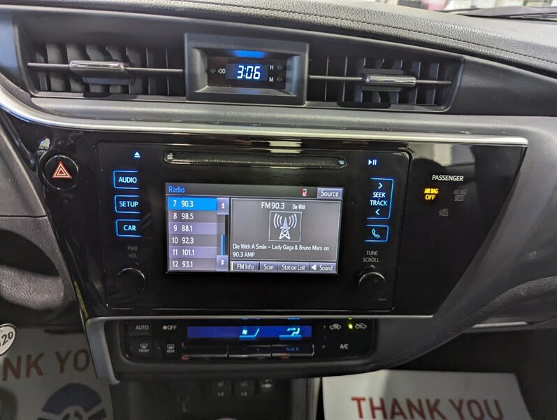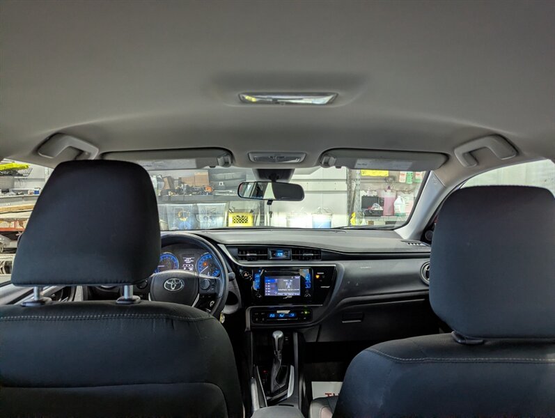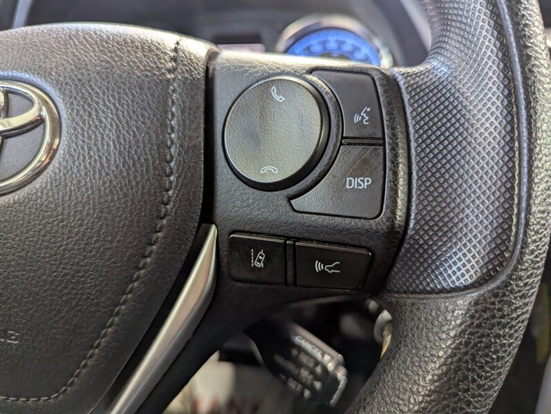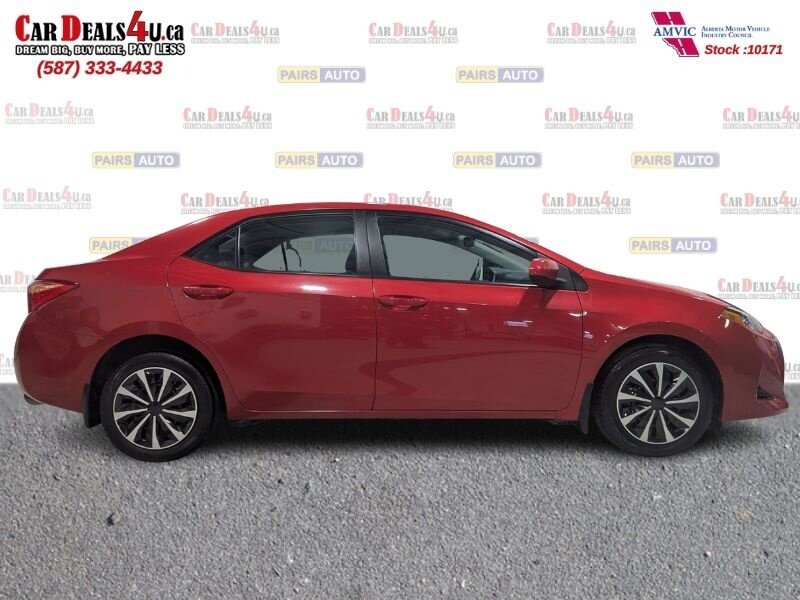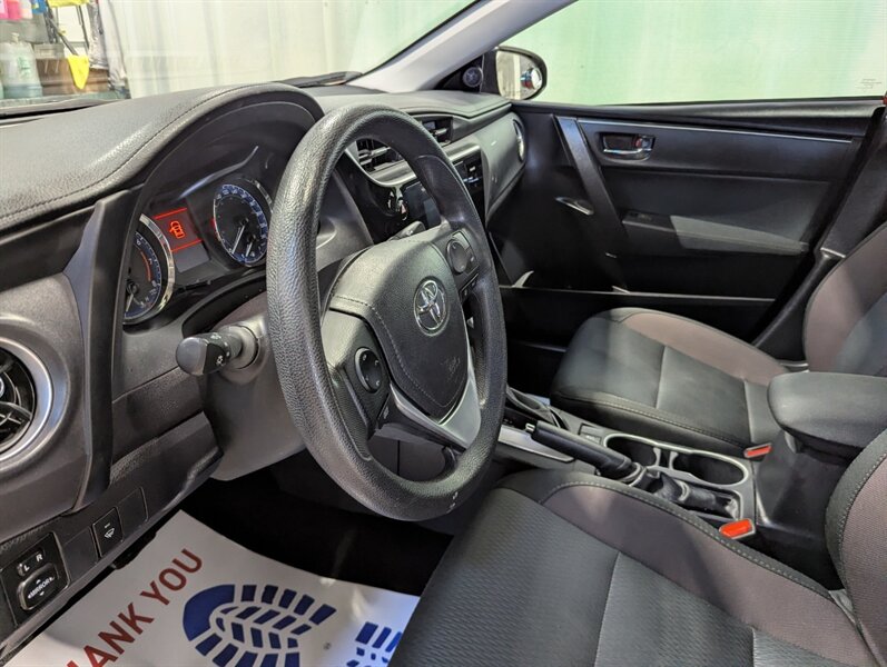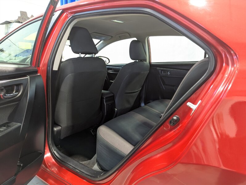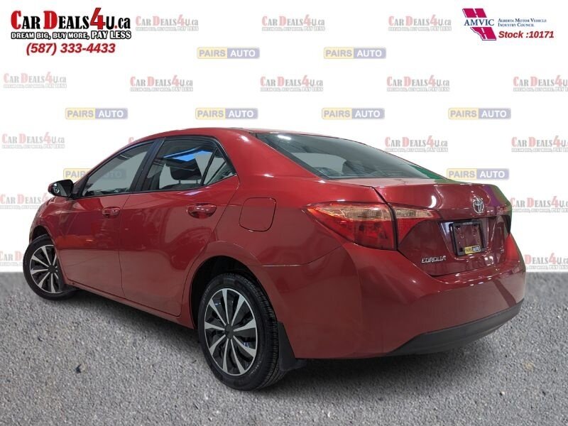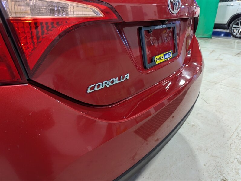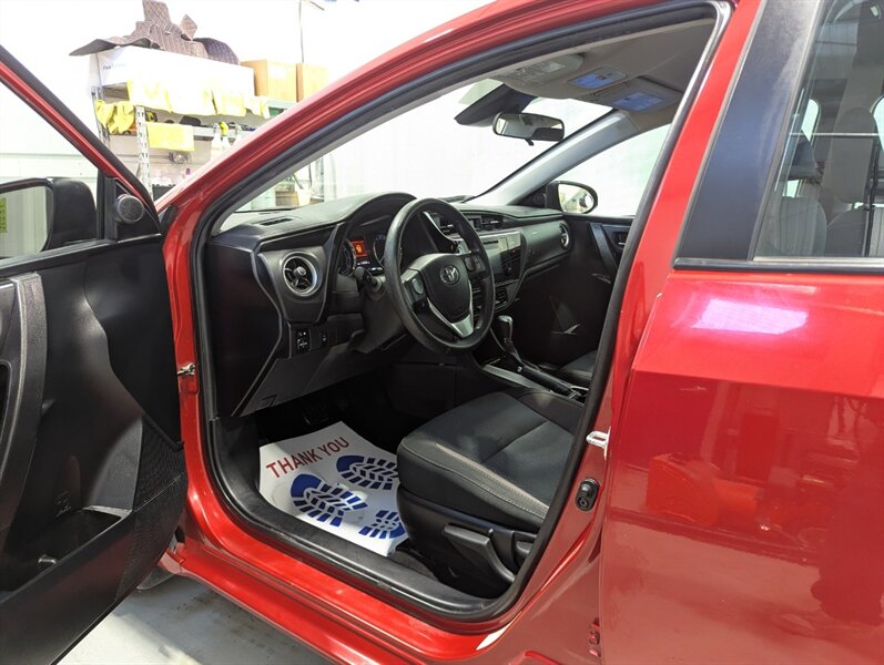 2017 Toyota Corolla LE in Barcelona Red Metallic with a Black cloth interior, powered by a 1.8L I4 (132 hp, 128 lb-ft) mated to a CVT. Factory equipment includes cloth seating with a 60/40 split-folding rear seat, power windows and door locks, remote keyless entry, air conditioning, tilt/telescoping steering wheel, and cruise control. Infotainment is Toyota Entune with a 6.1-inch display, Bluetooth hands-free and audio streaming, USB and auxiliary inputs, steering-wheel audio controls and a six-speaker system; a rearview backup camera is also included. Safety and convenience features from the factory include ABS with electronic brake-force distribution, traction and vehicle stability control, front, side and curtain airbags, and a tire pressure monitoring system. This vehicle is in excellent overall condition.