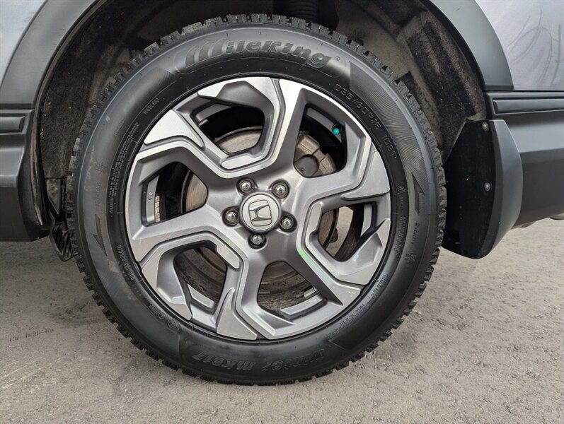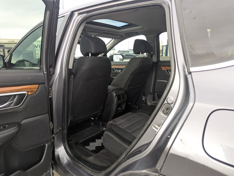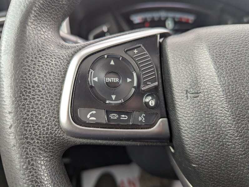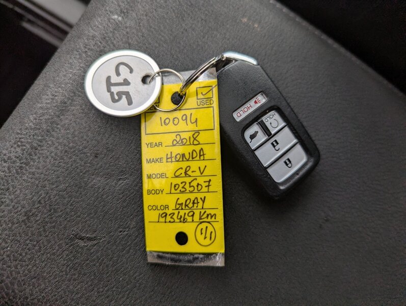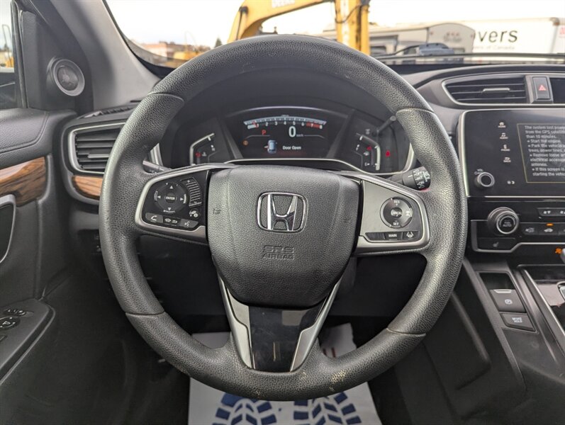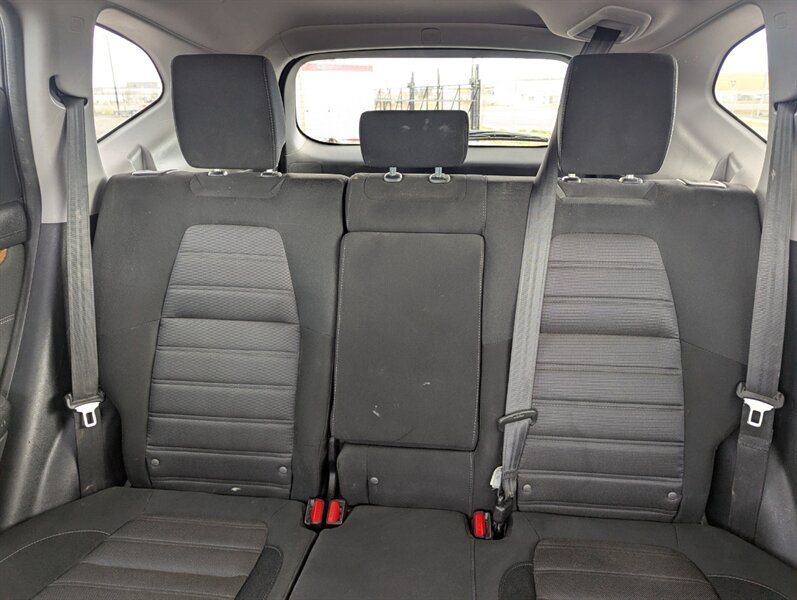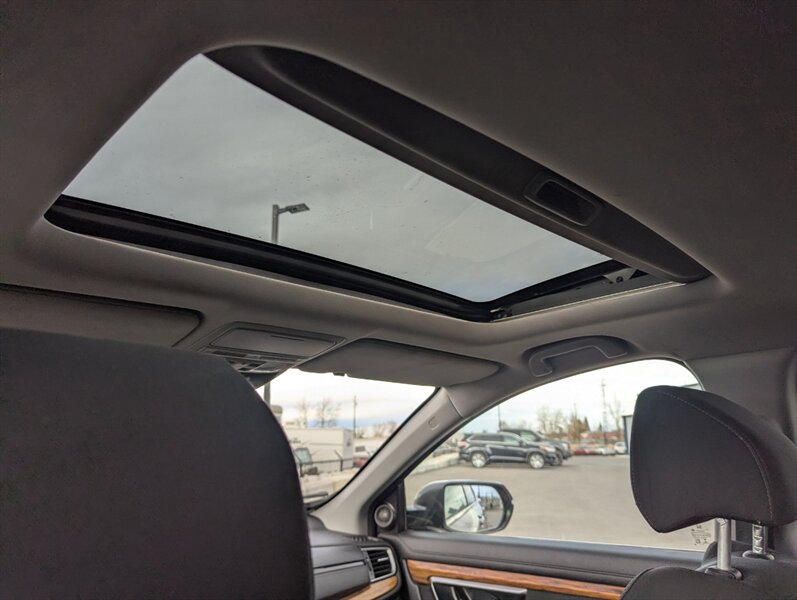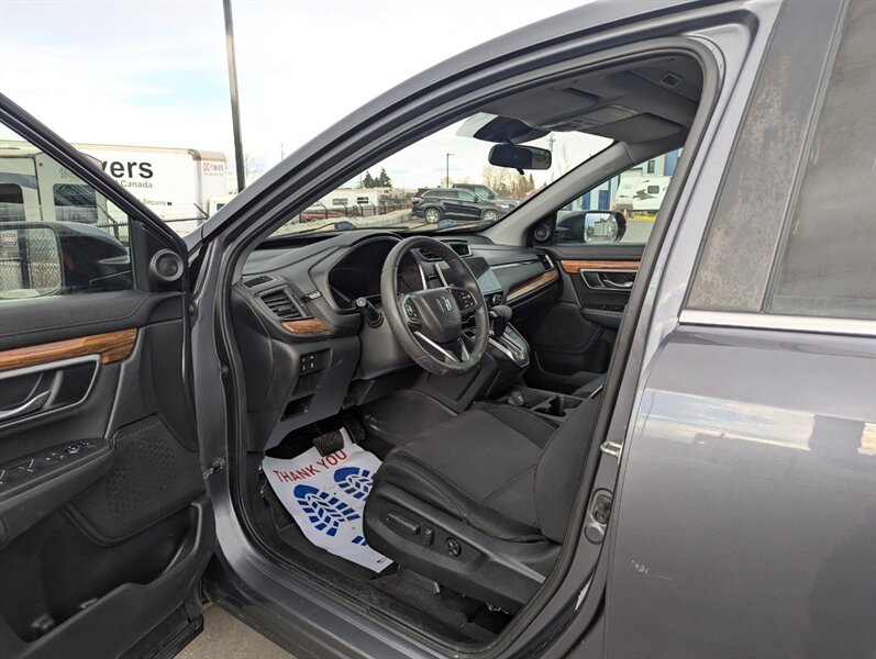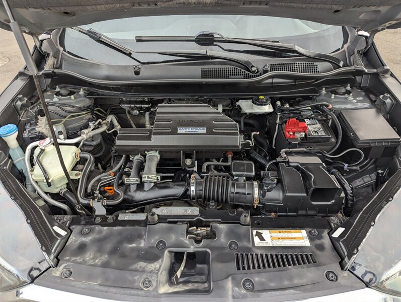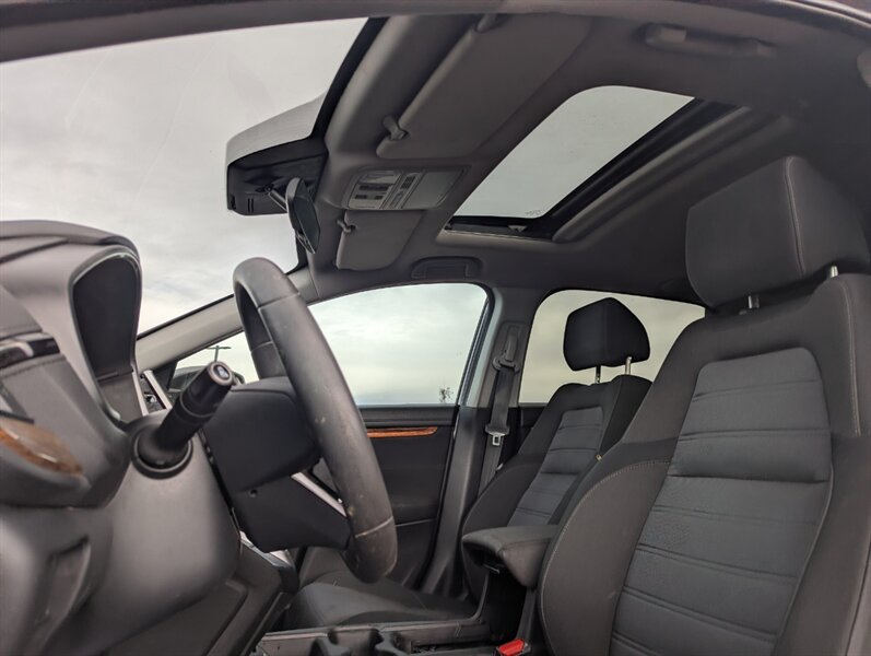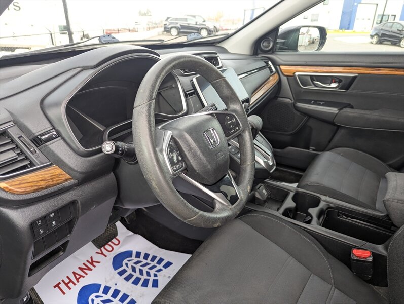 Introducing the 2018 Honda CR-V EX, a versatile and reliable SUV that combines performance with practicality. Powered by a 1.5L Turbocharged Inline-4 engine producing 190 horsepower and 179 ft-lbs of torque, this vehicle offers a smooth and efficient driving experience. The exterior showcases a sleek Gunmetal Metallic finish, while the interior features a comfortable Gray fabric that enhances passenger comfort. Standard factory features include a power moonroof, a multi-angle rearview camera, and Honda Sensing® safety suite, which encompasses collision mitigation braking, road departure mitigation, adaptive cruise control, and lane-keeping assist. Additional conveniences include a 7-inch touchscreen display with Apple CarPlay and Android Auto integration, dual-zone automatic climate control, and a spacious cargo area with a 60/40 split rear seat for added flexibility. This 2018 Honda CR-V EX is in excellent overall condition, ready to provide a dependable driving experience.