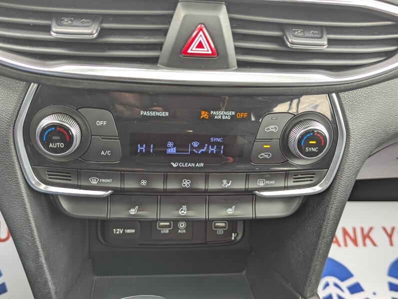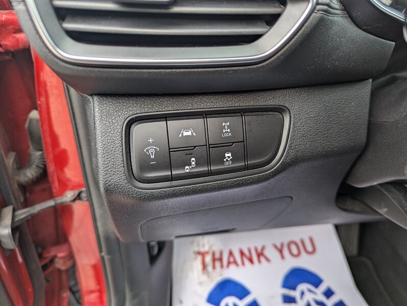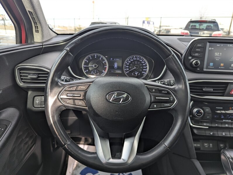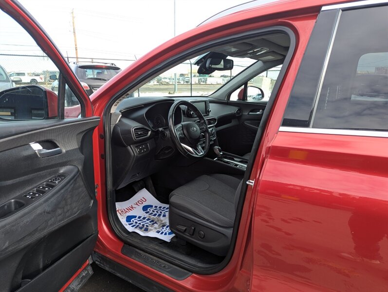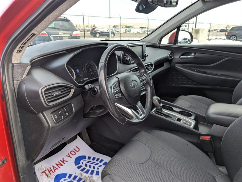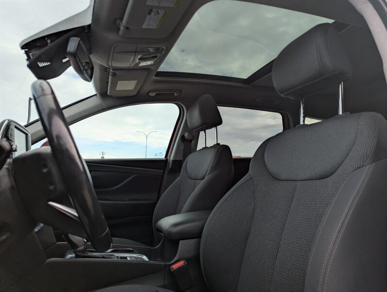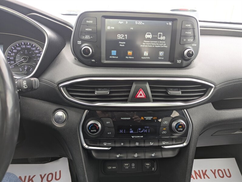 2019 Hyundai SANTA FE Preferred 2.0T — excellent overall condition. Factory-equipped with a 2.0L turbocharged four-cylinder engine (approx. 235 hp, 260 lb-ft) paired with an 8-speed automatic transmission; front-wheel drive is standard with all-wheel drive offered from the factory. Interior seating for five with 60/40 split-folding rear seats and power-adjustable driver’s seat. Standard safety and chassis systems include ABS, electronic stability control, traction control, hill-start assist, multiple airbags (front, side and curtain) and a tire pressure monitoring system. Comfort and convenience features from the factory typically include dual-zone automatic climate control, heated front seats, a leather-wrapped steering wheel, power windows and locks, remote keyless entry, and ample cargo tie-downs. Infotainment is factory-fitted with an 8-inch touchscreen audio system supporting Apple CarPlay and Android Auto, Bluetooth hands-free connectivity, USB inputs and a rearview camera. Higher or optioned factory packages may add features such as blind-spot detection with rear cross-traffic alert, parking sensors, upgraded audio, and leather seating surfaces.