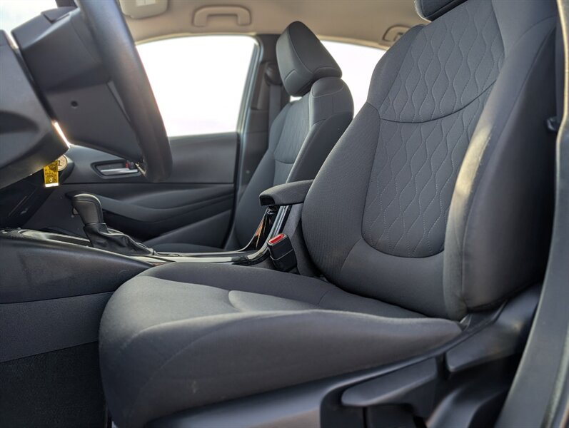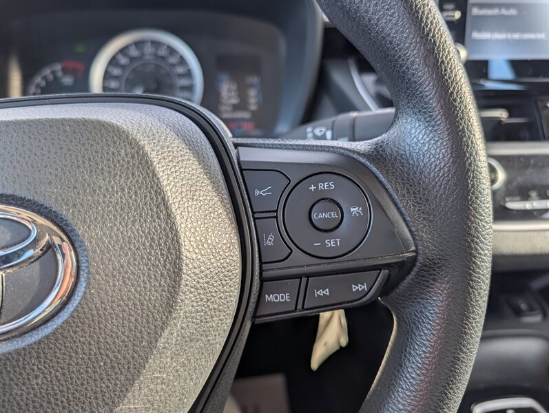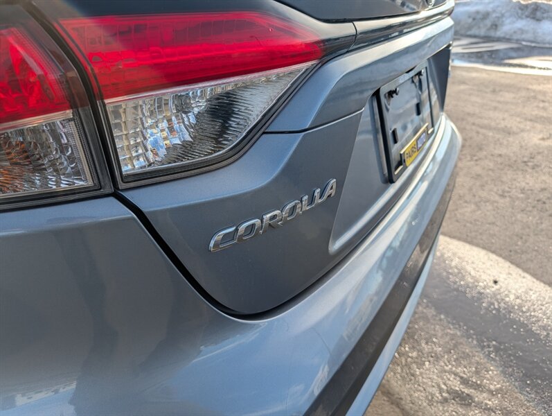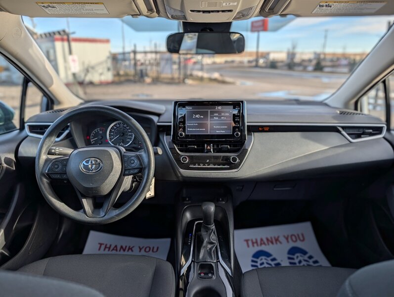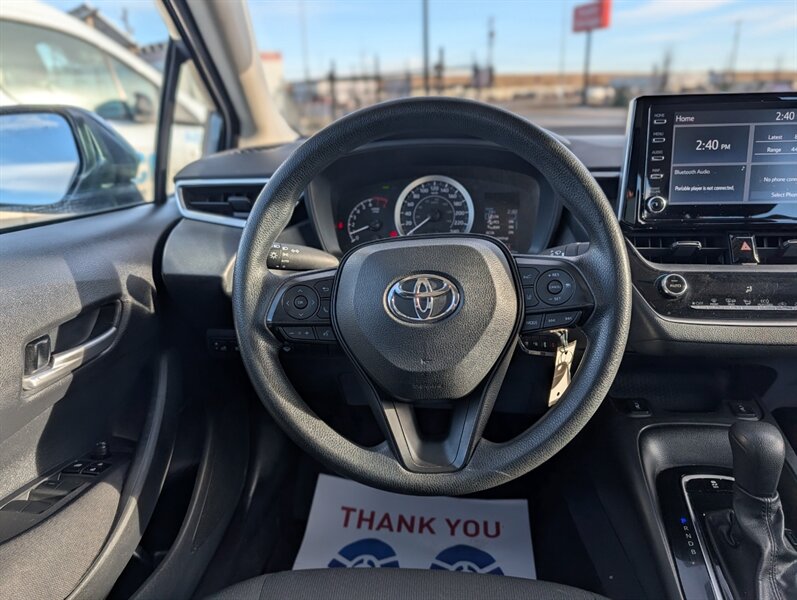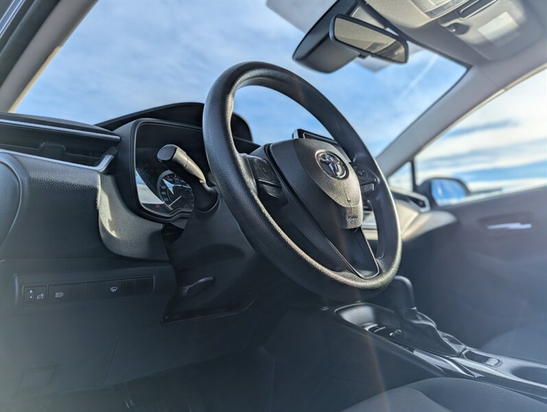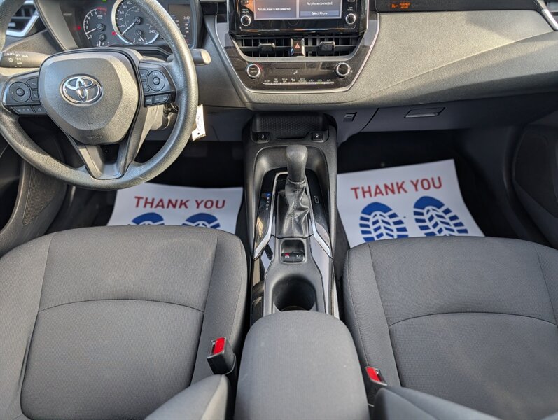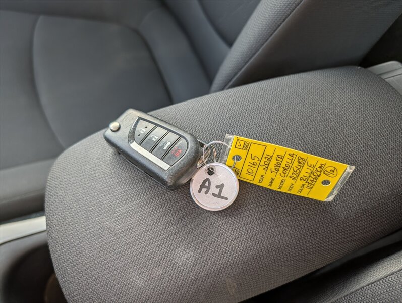 2021 Toyota Corolla LE — excellent overall condition. Factory-standard equipment includes a 1.8L four-cylinder engine paired with a continuously variable (CVT) transmission and front-wheel drive; the full Toyota Safety Sense 2.0 suite (Pre-Collision System with Pedestrian Detection, Dynamic Radar Cruise Control, Lane Departure Alert with Steering Assist and Lane Tracing Assist, Automatic High Beams, Road Sign Assist); and eight airbags plus a backup camera. Comfort and convenience features are cloth seating for five with a 60/40 split-folding rear seat, automatic climate control, remote keyless entry, power windows and locks, tilt/telescoping steering wheel and cruise control. Infotainment is handled by a 7-inch touchscreen with Apple CarPlay and Android Auto compatibility, Bluetooth hands-free/audio, USB connectivity and a six-speaker audio system.