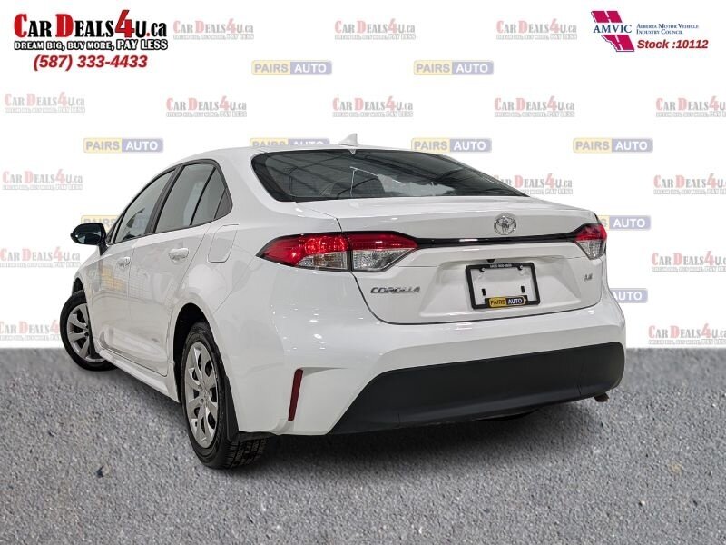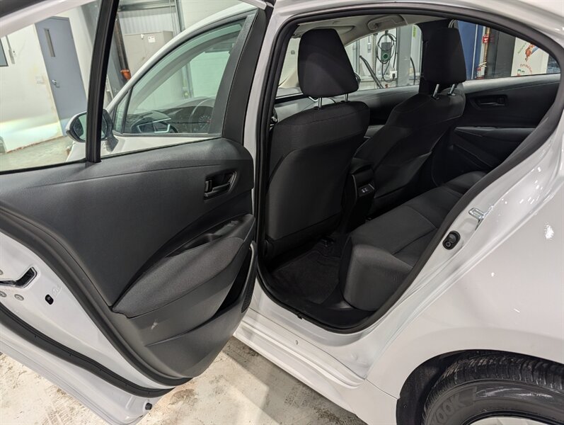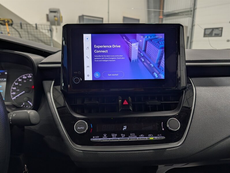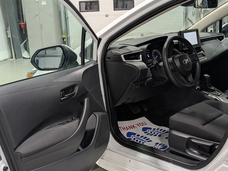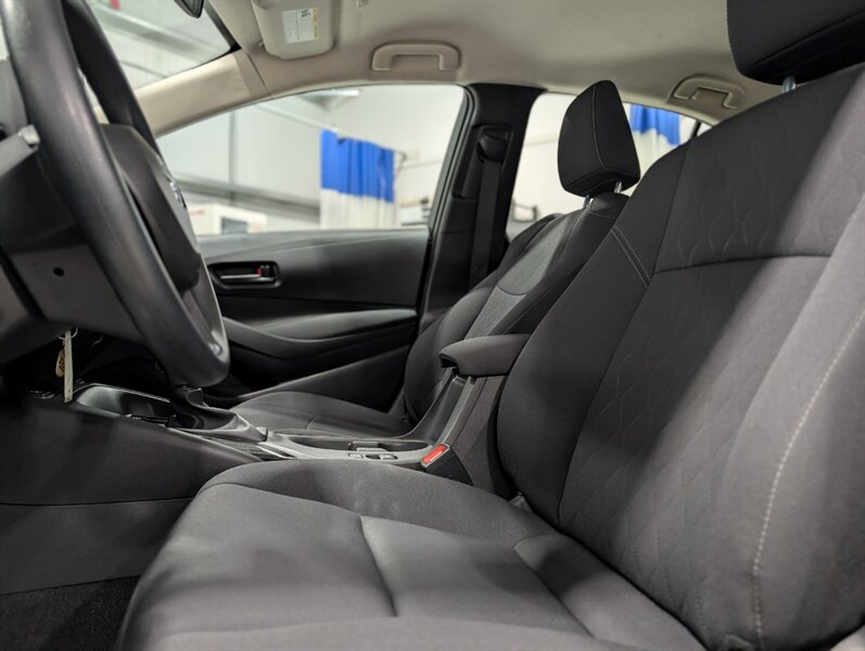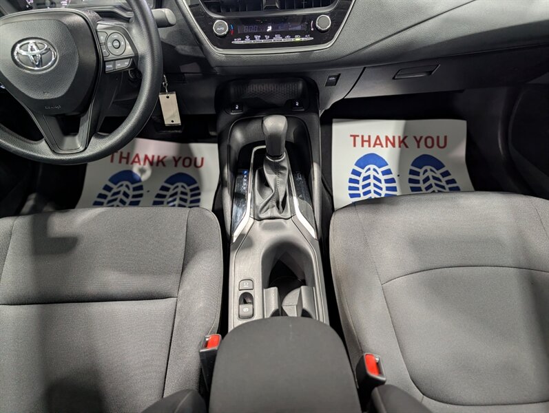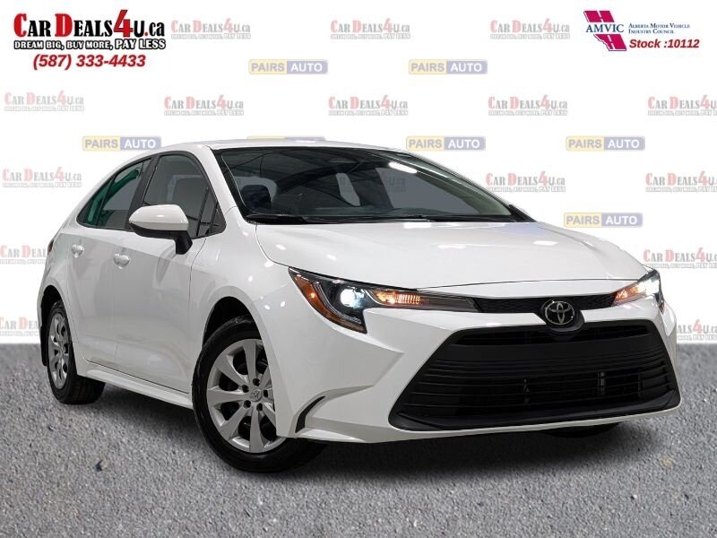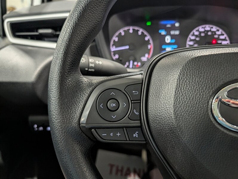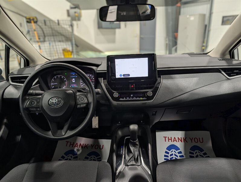 2025 Toyota Corolla LE powered by a 2.0L I4 (169 hp, 151 lb-ft) paired with a CVT. Factory-standard equipment includes the Toyota Safety Sense suite (pre-collision system with pedestrian detection, adaptive/full-speed-range radar cruise control, lane departure/steering assist and lane tracing assist, automatic high beams, and road sign assist), LED exterior lighting, and a rearview camera. Comfort and convenience features include a touchscreen infotainment system with Apple CarPlay and Android Auto, Bluetooth and USB connectivity, cloth seating with a 60/40 split-folding rear seat, power windows and locks with remote keyless entry, steering-wheel audio controls, cruise control, automatic climate control, and 16-inch wheels. Exterior is Celestite with a Black interior; vehicle is in excellent overall condition.